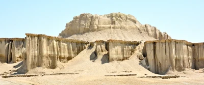 Water and wind erosion form most of the geological phenomena in Qeshm Island. Volumetric and columnar shapes are such phenomena that are seen in different places. Qazi Terrace is located in the west of Qeshm Island, in the way of the Gori village on the eastern coast of Qeshm Island to the south. In this area, volumetric and columnar shapes have been concentrated and gathered together as same as the walls, created a unique view. These remarkable figures are shaped as the result of several thousand years of water and wind erosion. In terms of geological value, this area has been registered as a Geosite of Qeshm Global Geopark, and in addition to the significant value and importance of geology, this site is exceedingly valuable in terms of educational, scientific, and research activities. - Geology This phenomenon is formed by water and wind erosion, which consists of two parts. The first part includes a set of mesas formed in the marl and sandstone layers of the Aghajari Formation. In some parts, as erosion progressively expands, the Hoodoos are also observable. Water erosion destroys ditches formed in unstable layers over time, and as a result, mesas and buttes also erode to form the hoodoos. In the second part, because of orogenic activity and successive folding, which causes the gradual rise of the Island, erosive forces have created precipices in sloping rock layers. On the edge of the resistant parts of the mentioned layers, the erosive shape of Hogback can be observed. Also, in the alluvial sediments of the present time, many traces of coral fossils can be observed at the bottom of the plain.