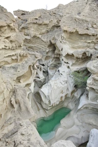 In the west of Qeshm Island and the north of Salakh anticline, there are several parallels, narrow and long valleys that each one has a unique landscape. Chakavir geosite is one of these valleys. In this valley, marl, limestone, and sandstone layers are regularly layered and erupted with small thicknesses up to big masses in which various types of erosion can be seen. Dissolution and water erosion in a sandstone layer with marl, silt, and lime have formed wonderful forms of small and large dissolution flutes (Rillenkarrens) and natural wells which are very similar to the stoves of old houses. The concave cavities and recessions of the walls in this strait have created a picturesque and amazing view. These forms are shaped as the result of flood currents that overrun the valley on rainy days. In this valley, we also see the formation of crenate walls that are created in two steps. In the first step, during heavy rains, a thick-washed stream of mud from the upper floors flows downwards in the form of a gutter and covers some parts of the wall of the lower floors. It covers the lower rock layers after drying as a mortar and protects it from further erosion. The spectacular and amazing walls of Chakavir Geosite have a high aesthetic value which is highly important to protect them from any damage. These walls have created a unique and wonderful perspective, especially for those who are interested in sightseeing and photography.